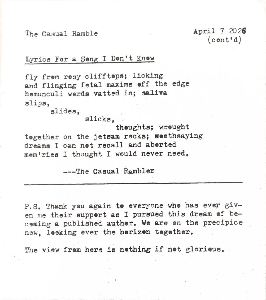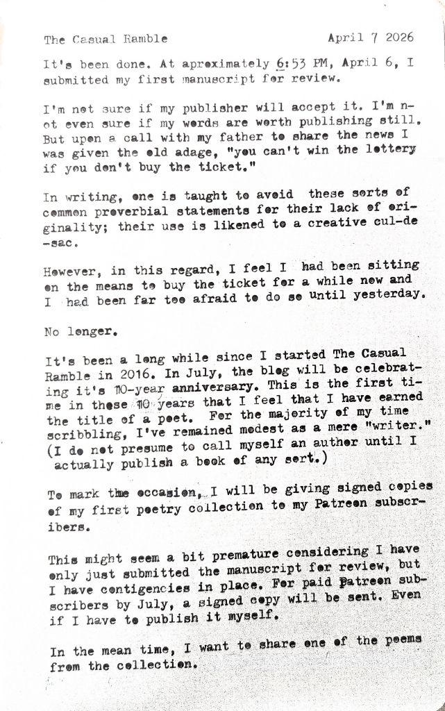 Ten years after starting this website, I have submitted the manuscript for my first ever poetry collection. Whatever happens, I will be working publishing the collection by summer’s end. And, as a special celebration for the ten-year anniversary of The Casual Ramble, I have a gift for all paid subscribers by July 1st. Read about it below!