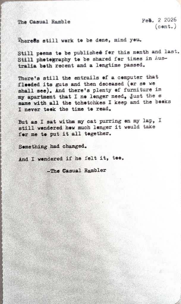 Thank you to my Patreon subscribers, including Jenny, Michael, Roshi, Zero and Phil for being such patient and supportive persons. Your support makes this enterprise possible and for that I am eternally grateful. If you would like to join our awesome group of Casual Ramblers, click on the button below! Patrons receive exclusive access to quarterly short stories, and early access to my monthly poetry and photography posts.