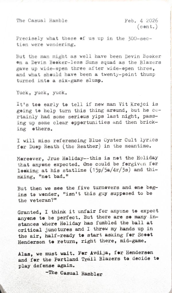 I probably should have sold the tickets or something to recoup costs, but to hell with it, I just wanted to see the team. Unfortunately, I am not sure the team really wants to be seen without Deni Avdija. Still, I watched the game against the Phoenix Suns (who were missing Devin Booker to an ankle injury) and wrote some thoughts about it this morning.