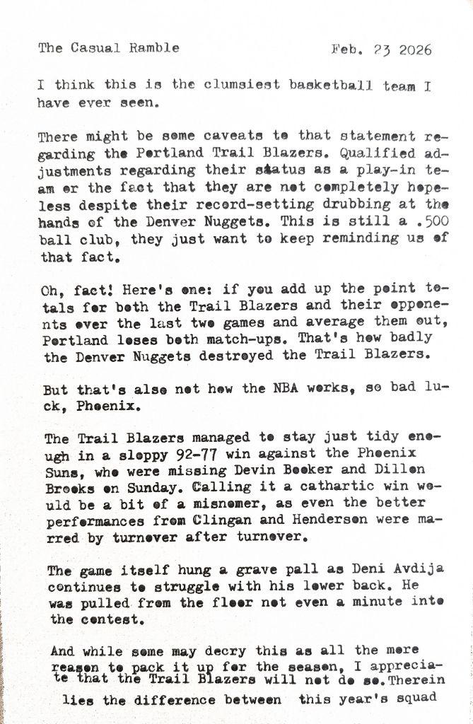 I have to apologize for the Casual Update coming in so late. I spent my weekend not doing the work I should have done. Not until 11pm last night after watching the Portland Trail Blazers close out a particularly clumsy win.