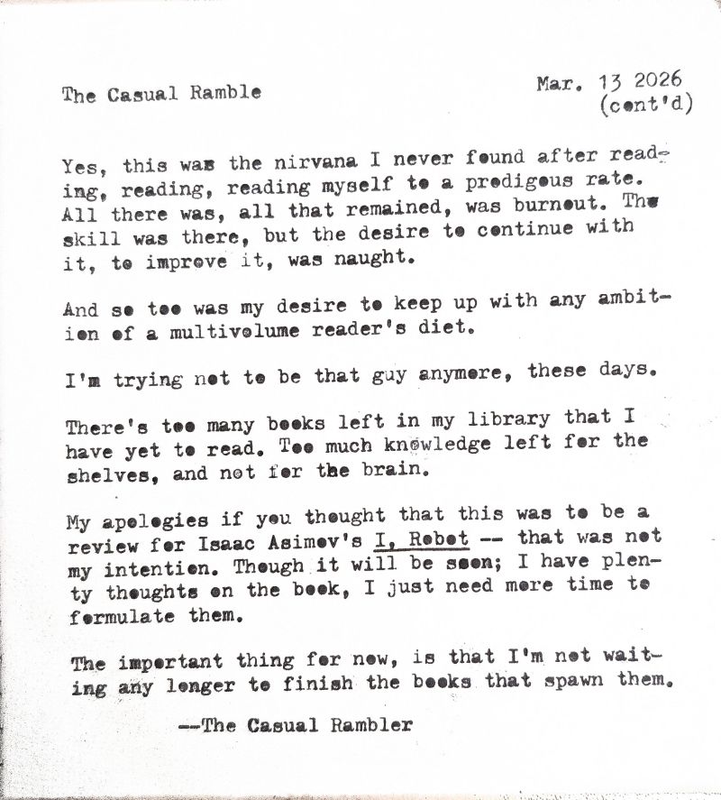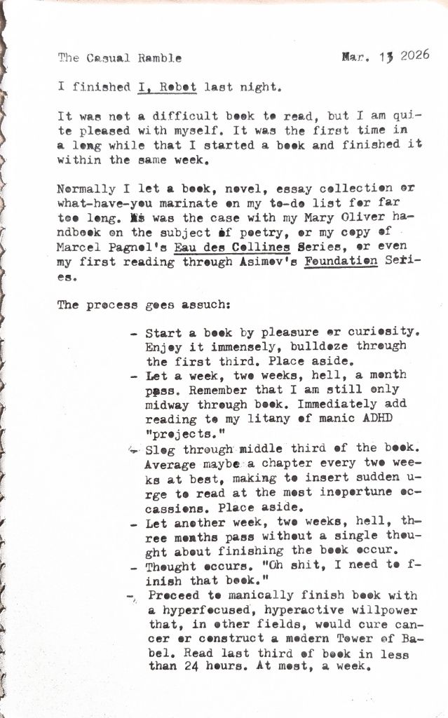 So there’s a certain satisfaction that has come with finishing I, Robot by Isaac Asimov. There’s a certain satisfaction that has come with writing about his work. And there’s a certain satisfaction in reclaiming an activity I once thought was lost due to years of academic reading.