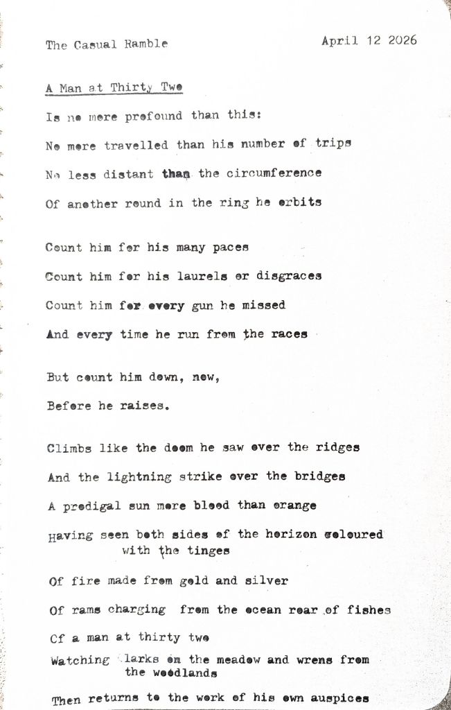 I didn’t have much bandwith for a proper ramble today. So, I stepped back, played a board game with my coworkers, and then sat down to scribble a poem about my age. It’s a first draft, and I already have ideas where to go with it, but for now I say we all just enjoy it as it is. A newborn poem is a rare moment.