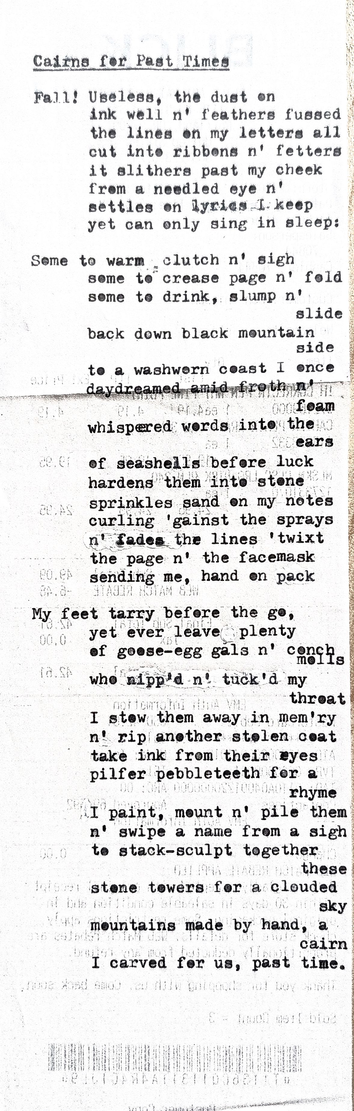 - “Cairns for Past Time” was written somewhere in 2018. I recall writing the first lines in an airport en route to the states. What started as an experiment in flowery, 19th century romanticism and then proceeded to become a whole hell of a lot more as I became enamored with images of rock balancing and cairn-building as a way to commemorate past life events with an eye towards the fact that these words, like the stones, would not last forever. It needs another pass, but reworking it helped bring its final form into focus.