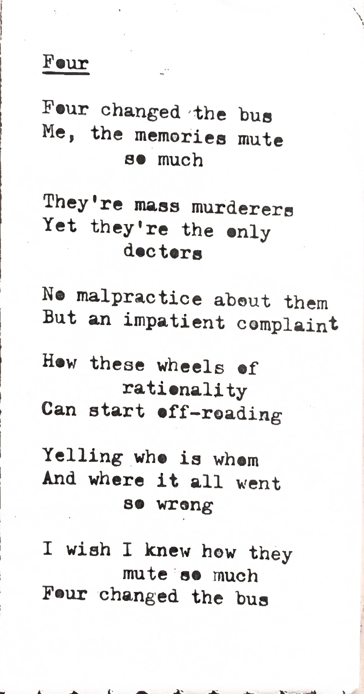 - “Four” was written in high school. Can you tell? The original inspiration came from two different rides on the school bus and how the faces had changed. The metaphor is a bit on the nose, but the idea that memories lie or self-edit certain details became a through-line that I just could not ignore.