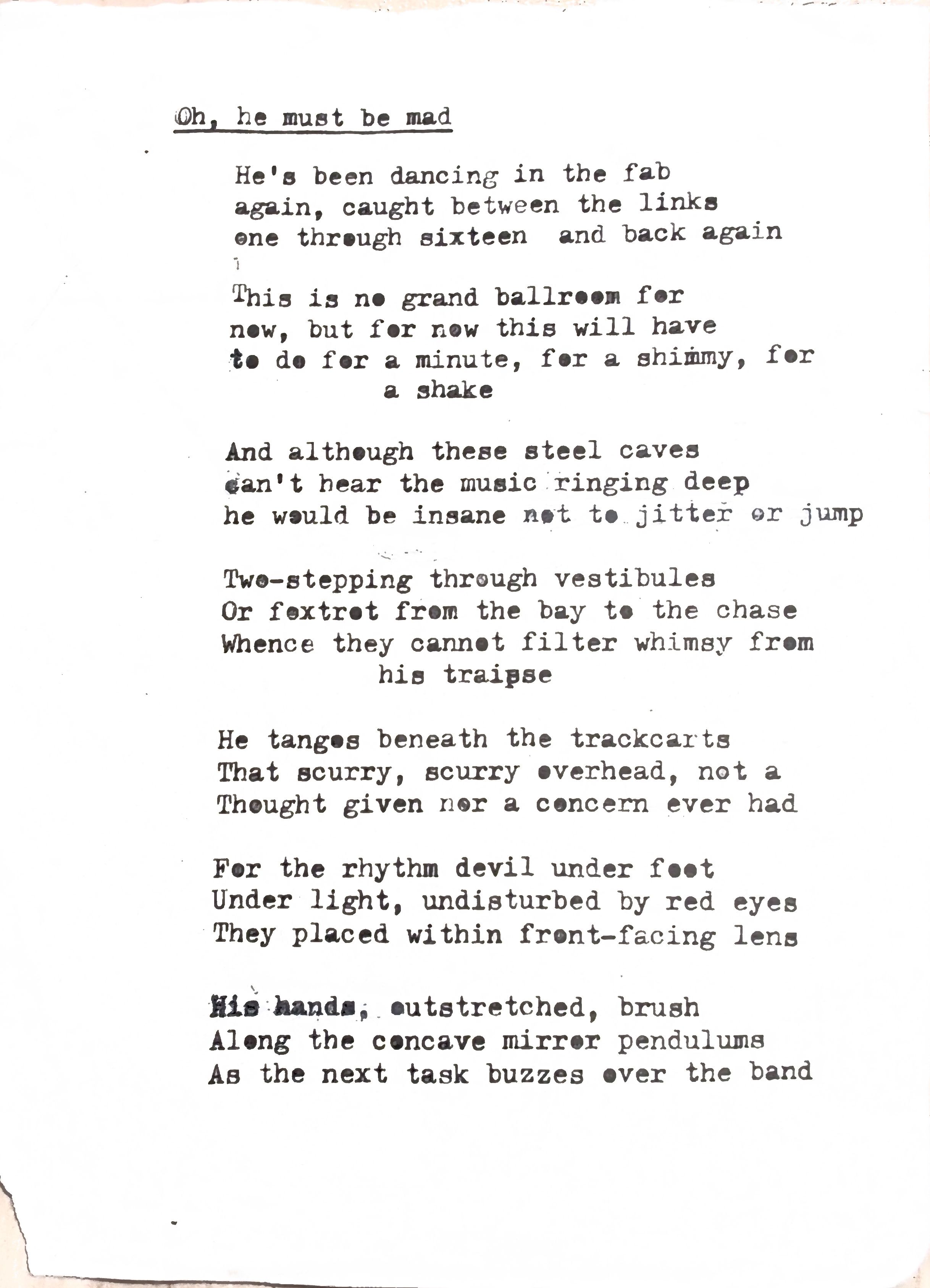 - “He Must Be Mad” is the most recent of the bunch, written last year after I ensconced myself in the factory at my work. It’s frowned upon to dance “in the fab” for safety reasons, but I decided to throw caution to the wind and dance in the hallways between the factory floors. It’s a full embrace of the simple fact that my job is not my career and the joy I receive from engaging in spontaneous, whimsical creativity does more to sustain me than any dollar amount.