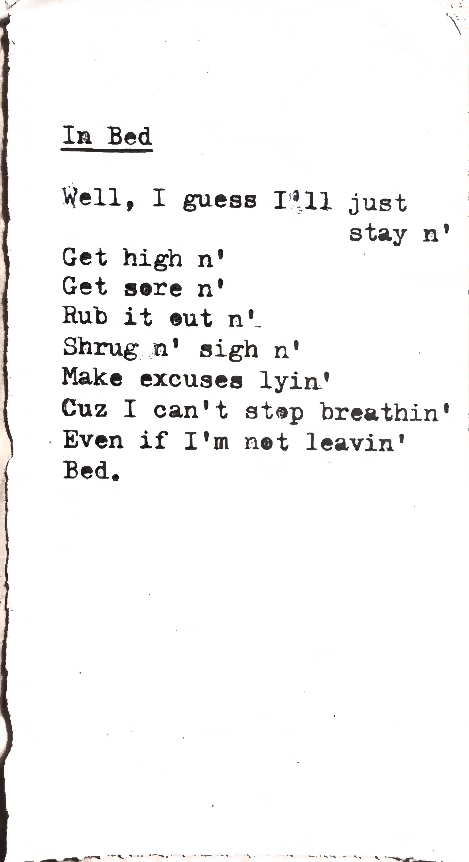 - “Bed” was written after university during a major depressive episode. It may not be surprising, but I have struggled with depression. I have never been full on diagnosed, however, because I have faith in my ability to sort myself out without medications but sometimes the pit goes deep and it takes a climb (don’t get it twisted, either, therapy is absolutely vital). This poem is about the pit and the things we do when we don’t want to climb.