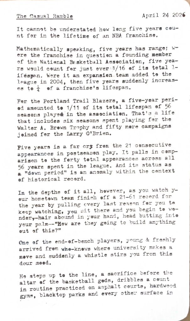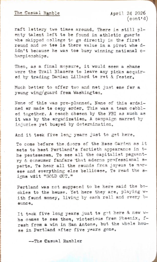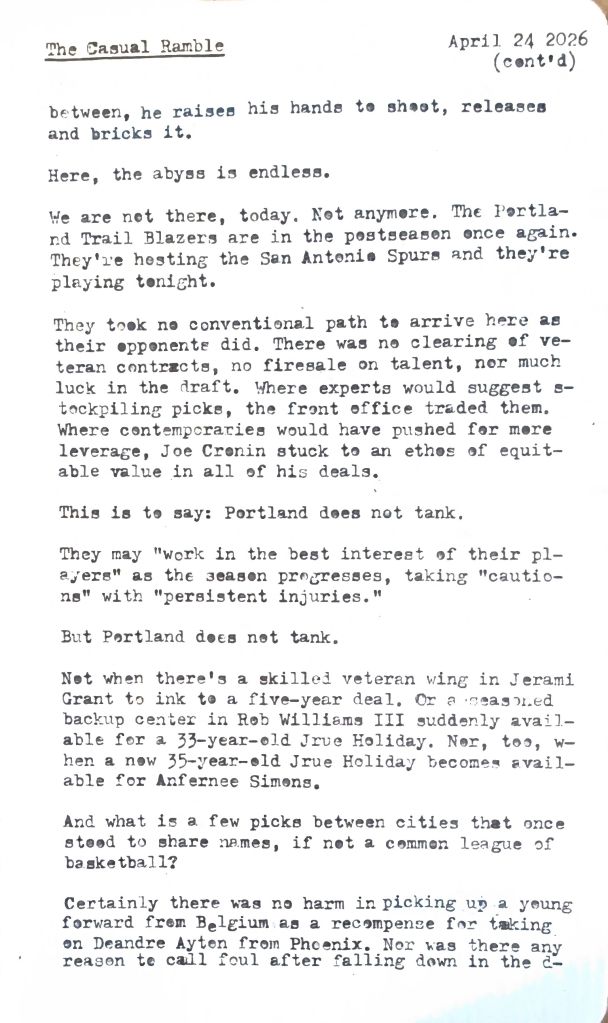 The Portland Trail Blazers are in the postseason with a chance to take control of their first playoff series in five years. The San Antonio Spurs may be without Victor Wembanyama, but they are still a fearsome opponent all the same. I’m not here to make predictions or provide insight to what might happen on the court.